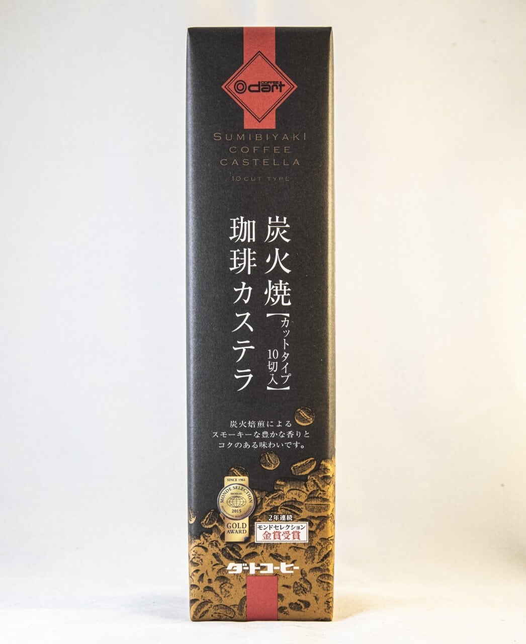 フレンチローストに焙煎した珈琲豆を抽出し、カステラの本場長崎で生地に練り込み焼き上げました。長崎カステラの持つ甘み、しっとり感と珈琲の風味が絶妙のバランスで好評をいただいております。